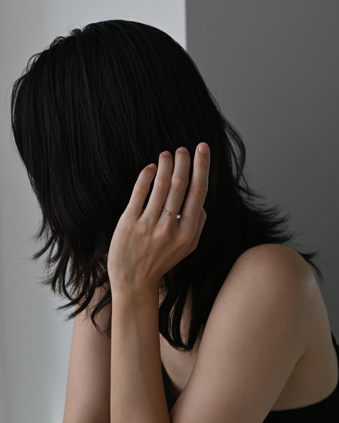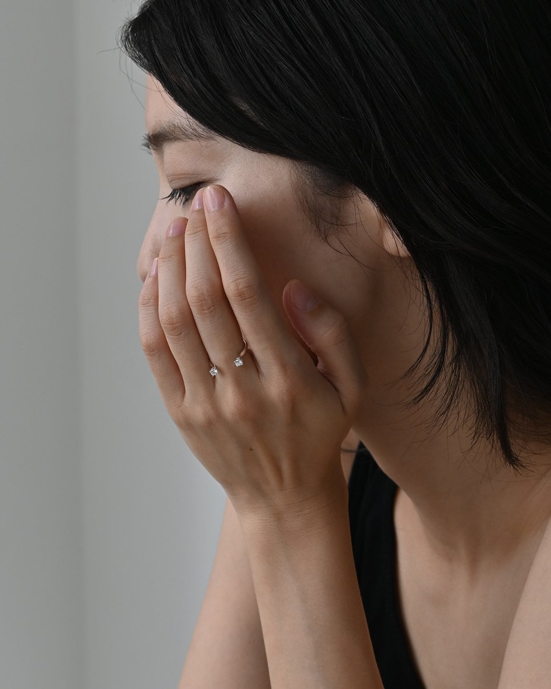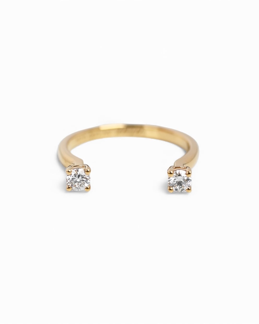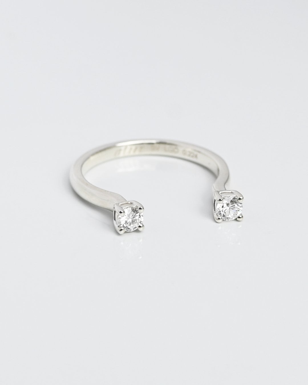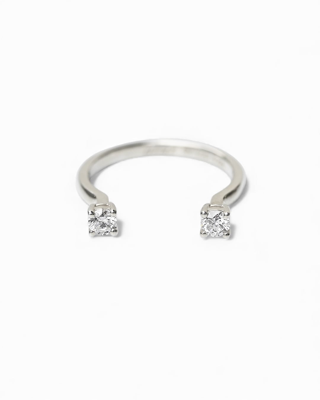静寂の中に凛と輝きを放つ、オープンデザインのリング。2石のラウンドカットのラボグロウンダイヤモンドが指の上で光を受けて繊細に揺らめきます。