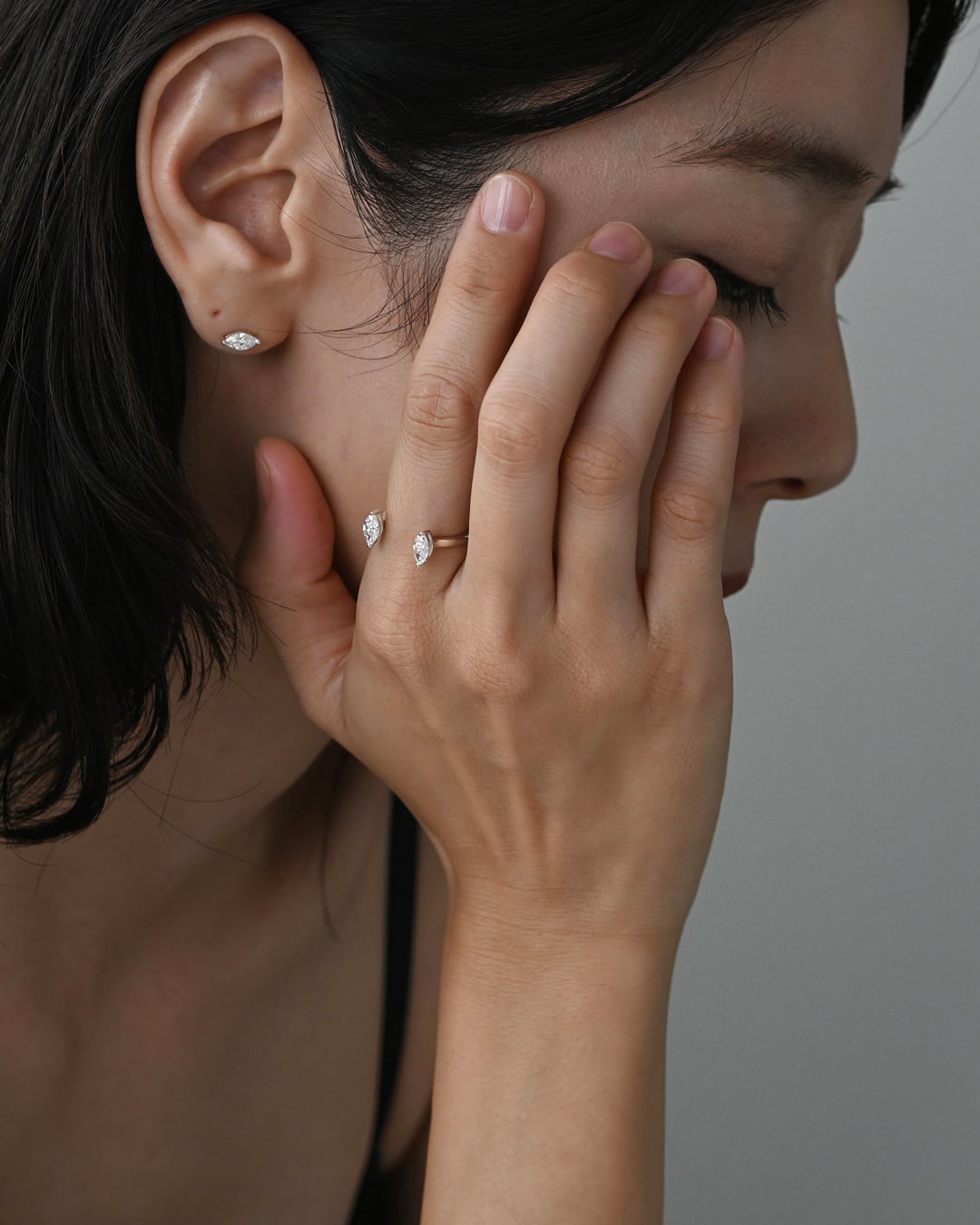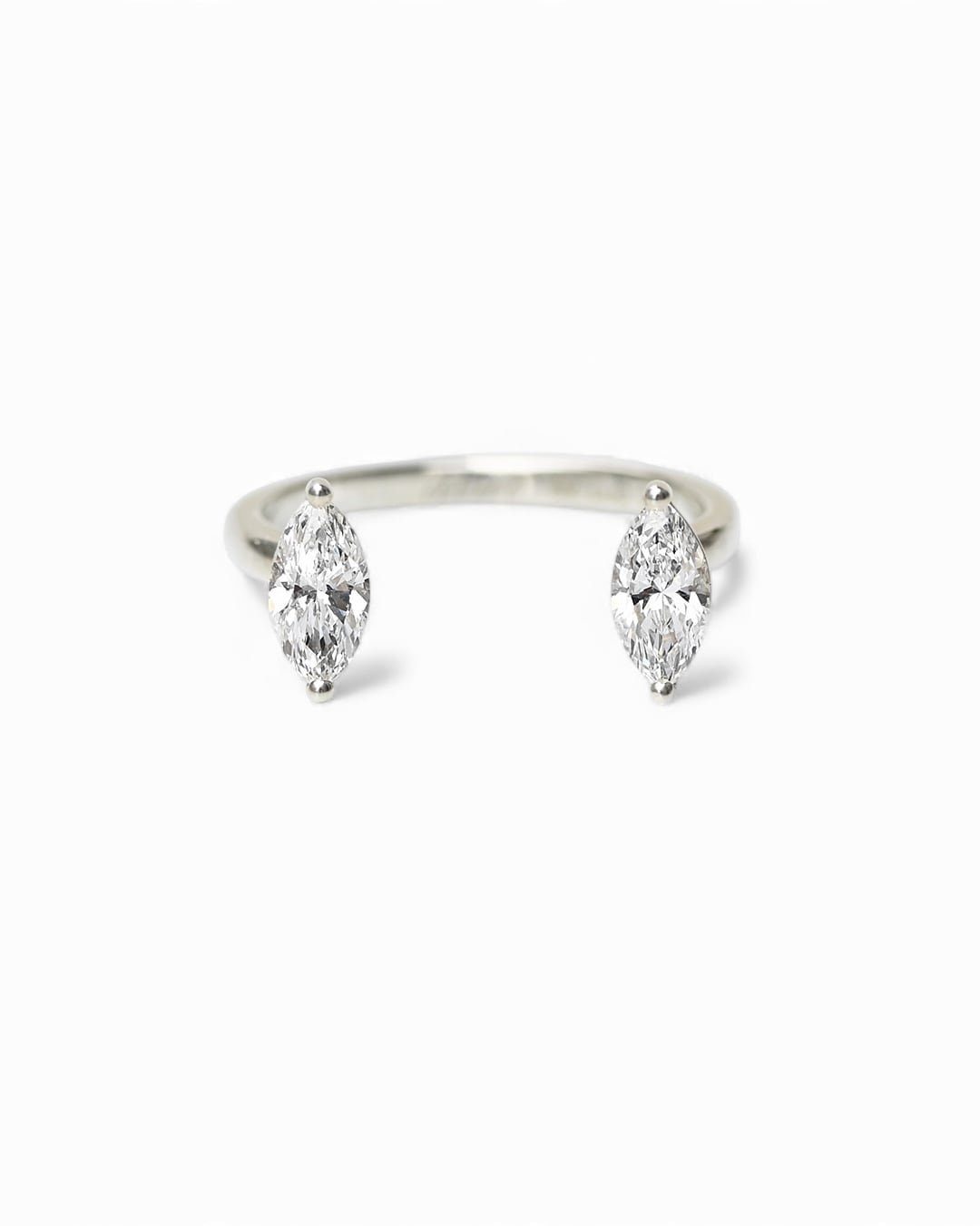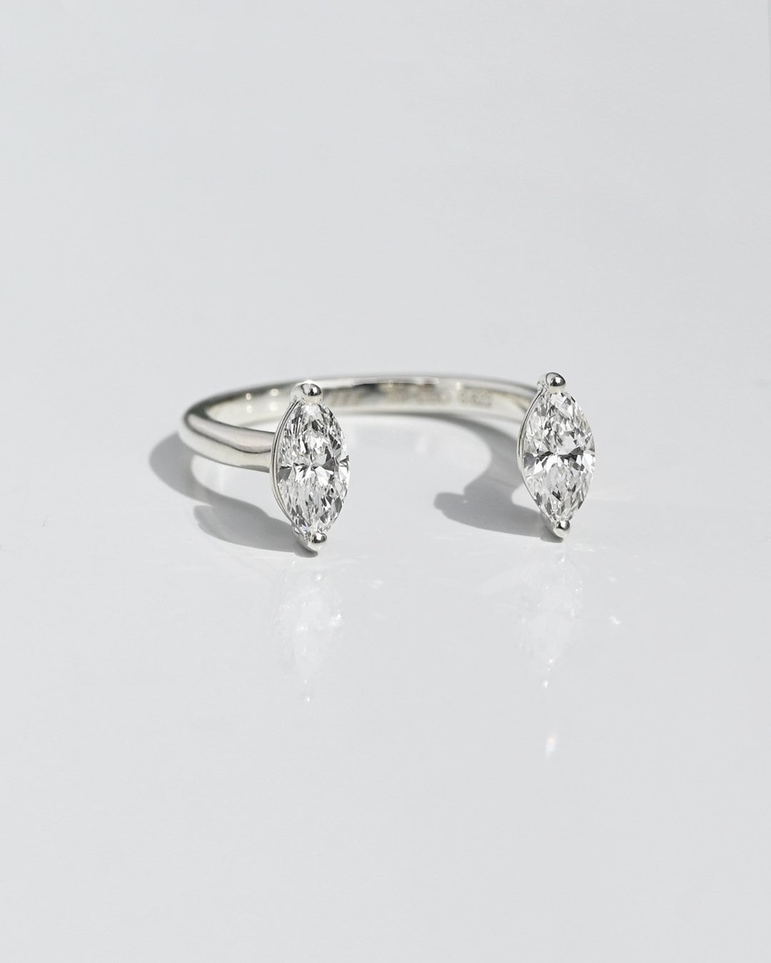 静寂の中に凛と輝きを放つ、オープンデザインのリング。2石のマーキスカットのラボグロウンダイヤモンドが指の上で光を受けて繊細に揺らめきます。