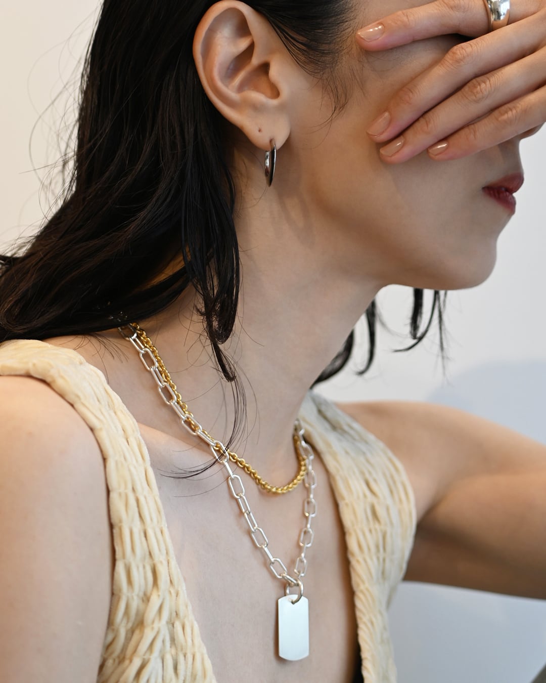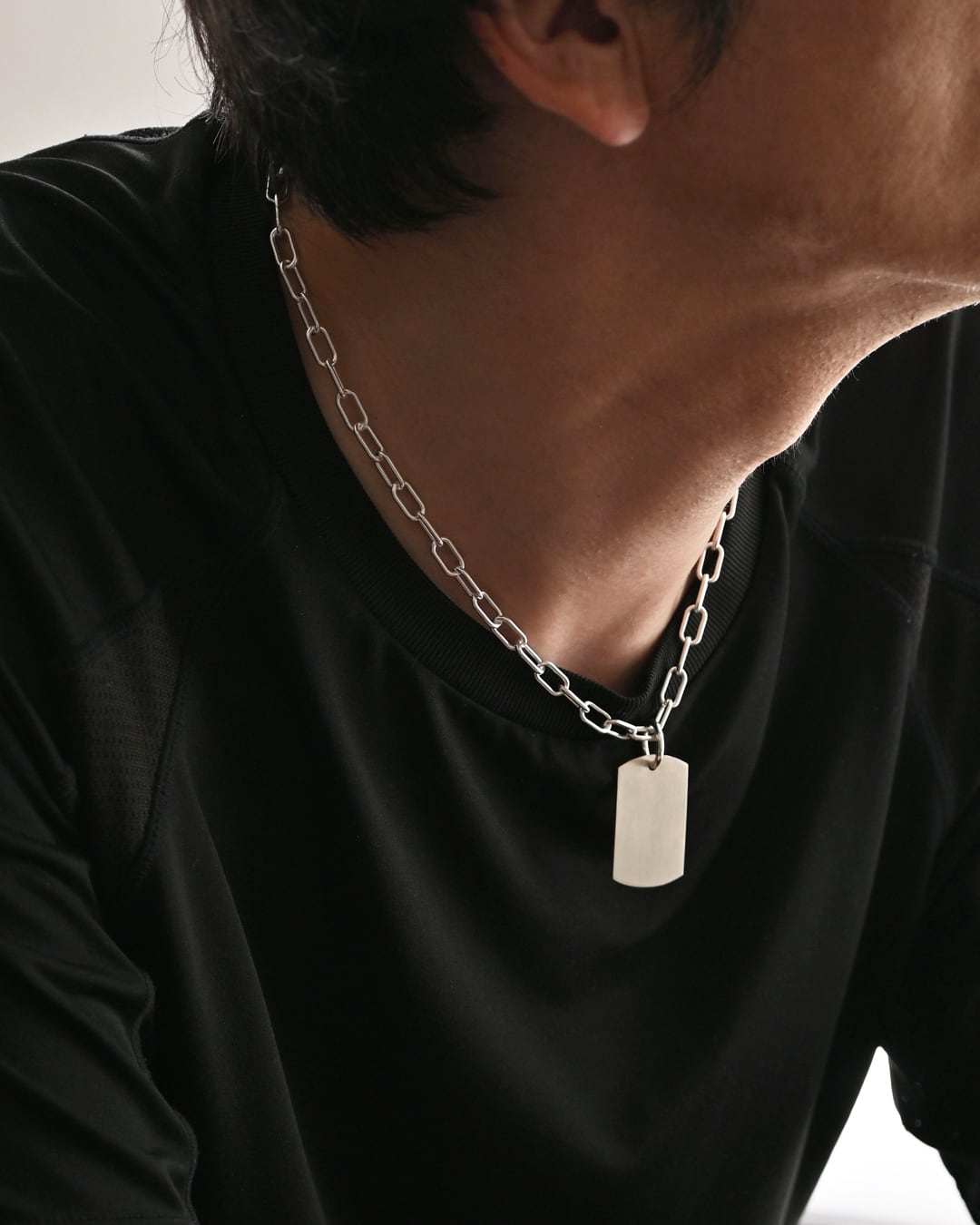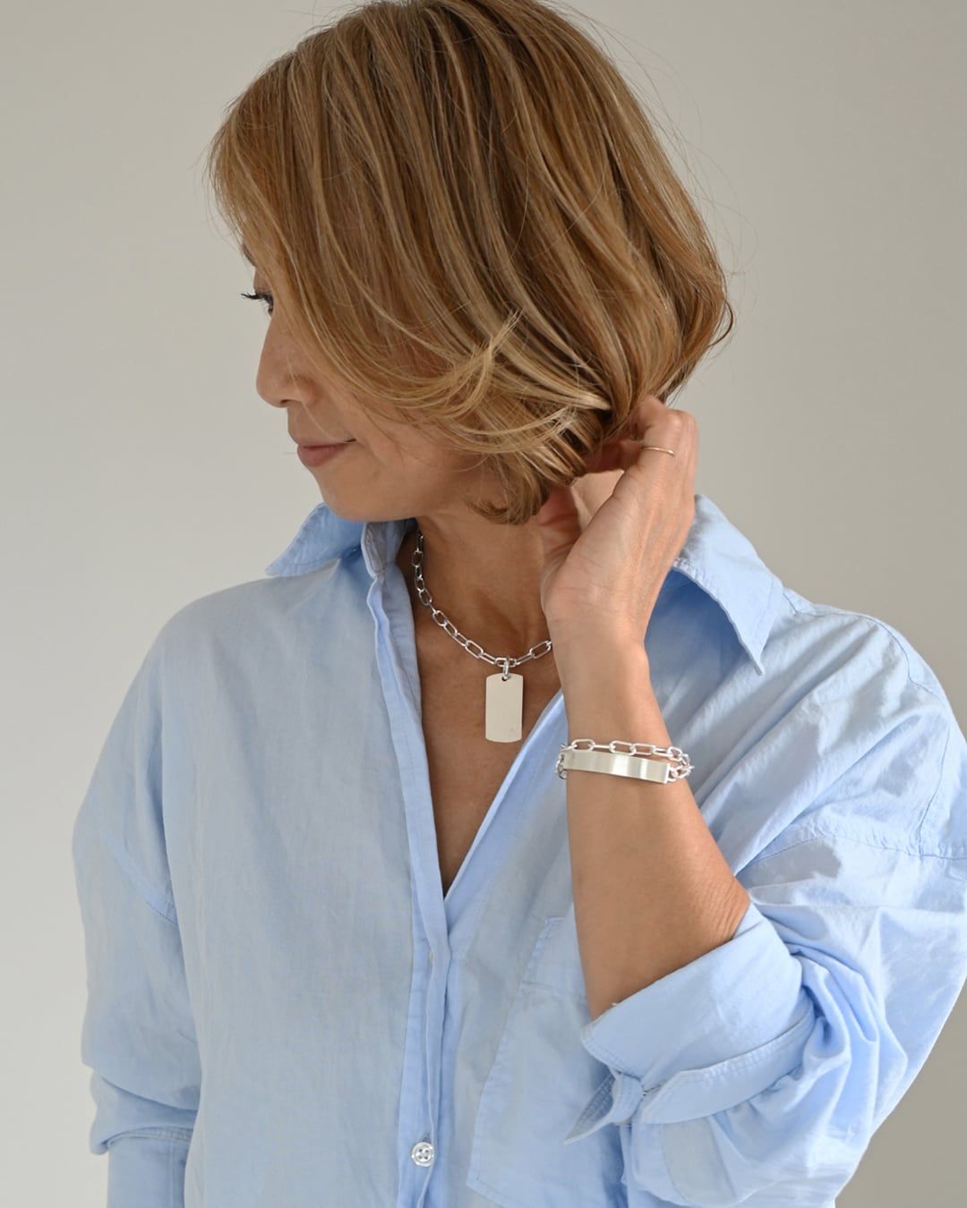 プレートの表面はヘアライン加工によりピカピカと光り過ぎないので、日常のスタイリングに馴染み、もともとつけていたようなこなれ感を演出します。プレートのサイドは鏡面仕上げと、細部にもこだわりました。