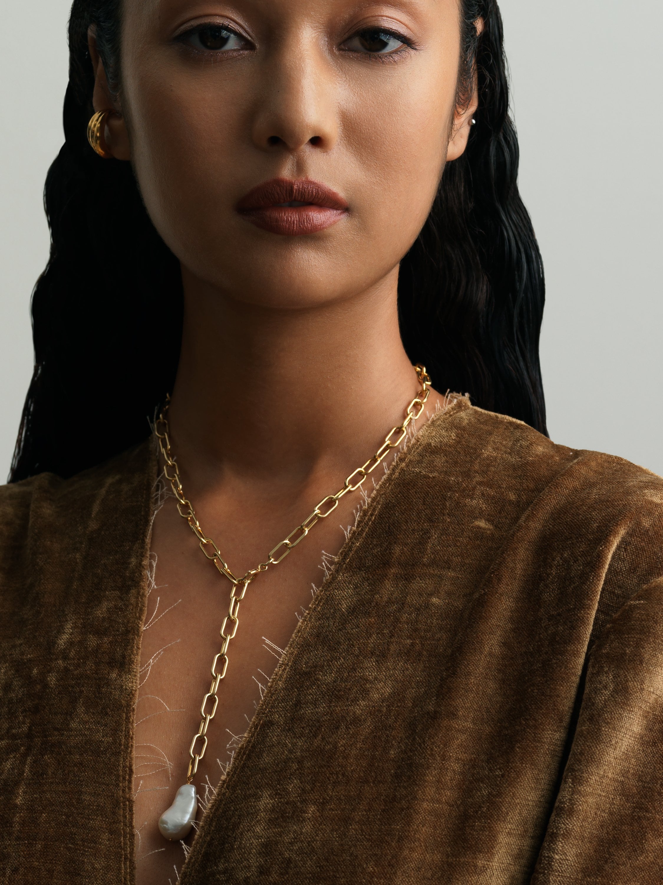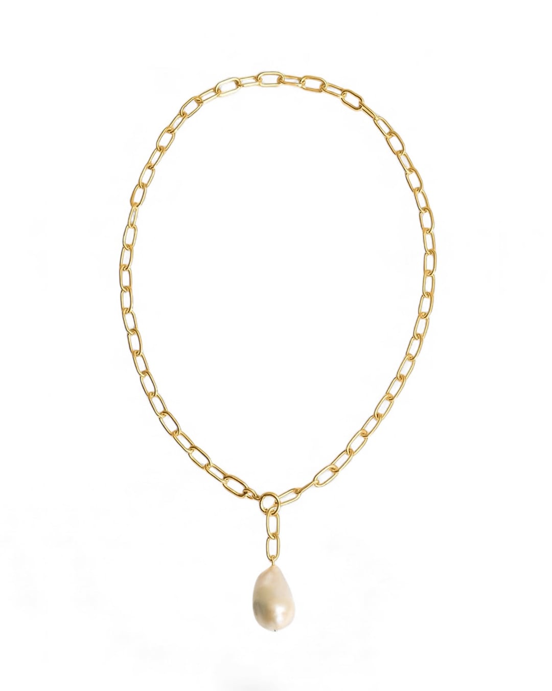 ひとつひとつ形の異なるバロックパールに存在感のあるチェーンを合わせたネックレスです。好きな位置で長さを調整できるので、様々なスタイリングに合わせることができます。
