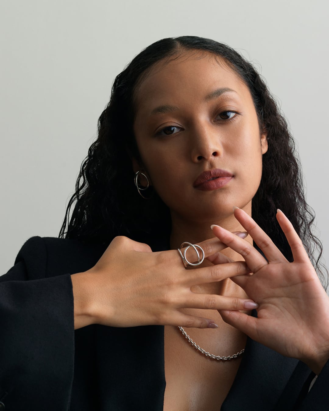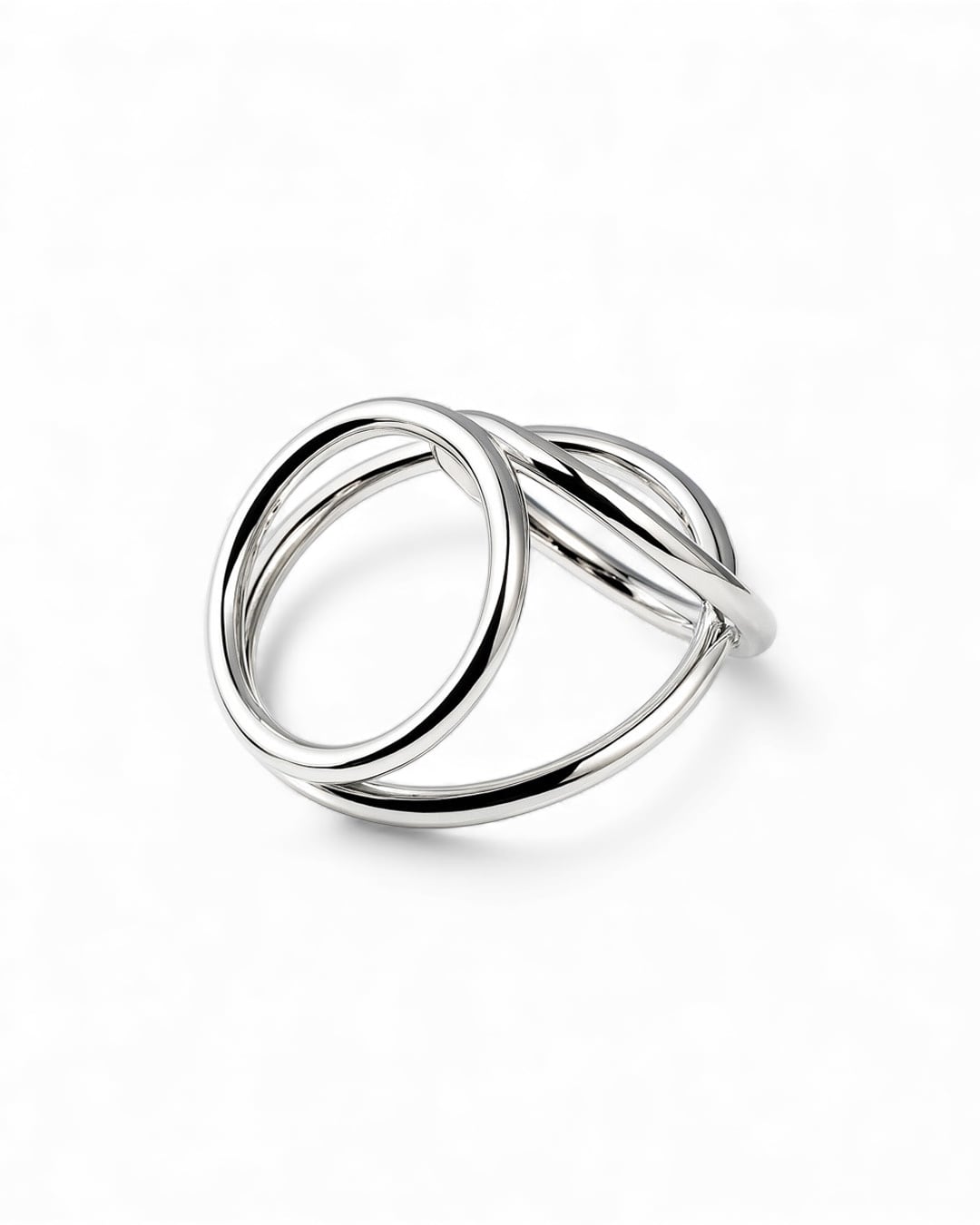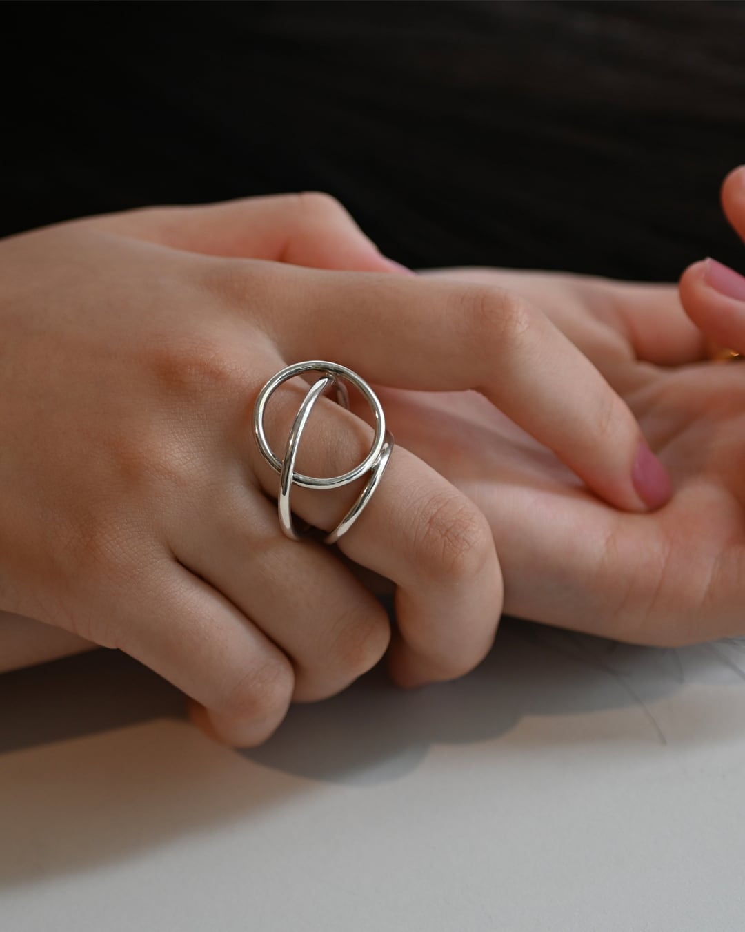 3つの円が重なり合った、立体感なフォルムが特徴のリング。指にはめると独特なリズムと浮遊感が生まれます。指の輪郭を大きくはみ出すデザインなので、他の指へのあたりが気になる方は、人差し指での着用がオススメです。