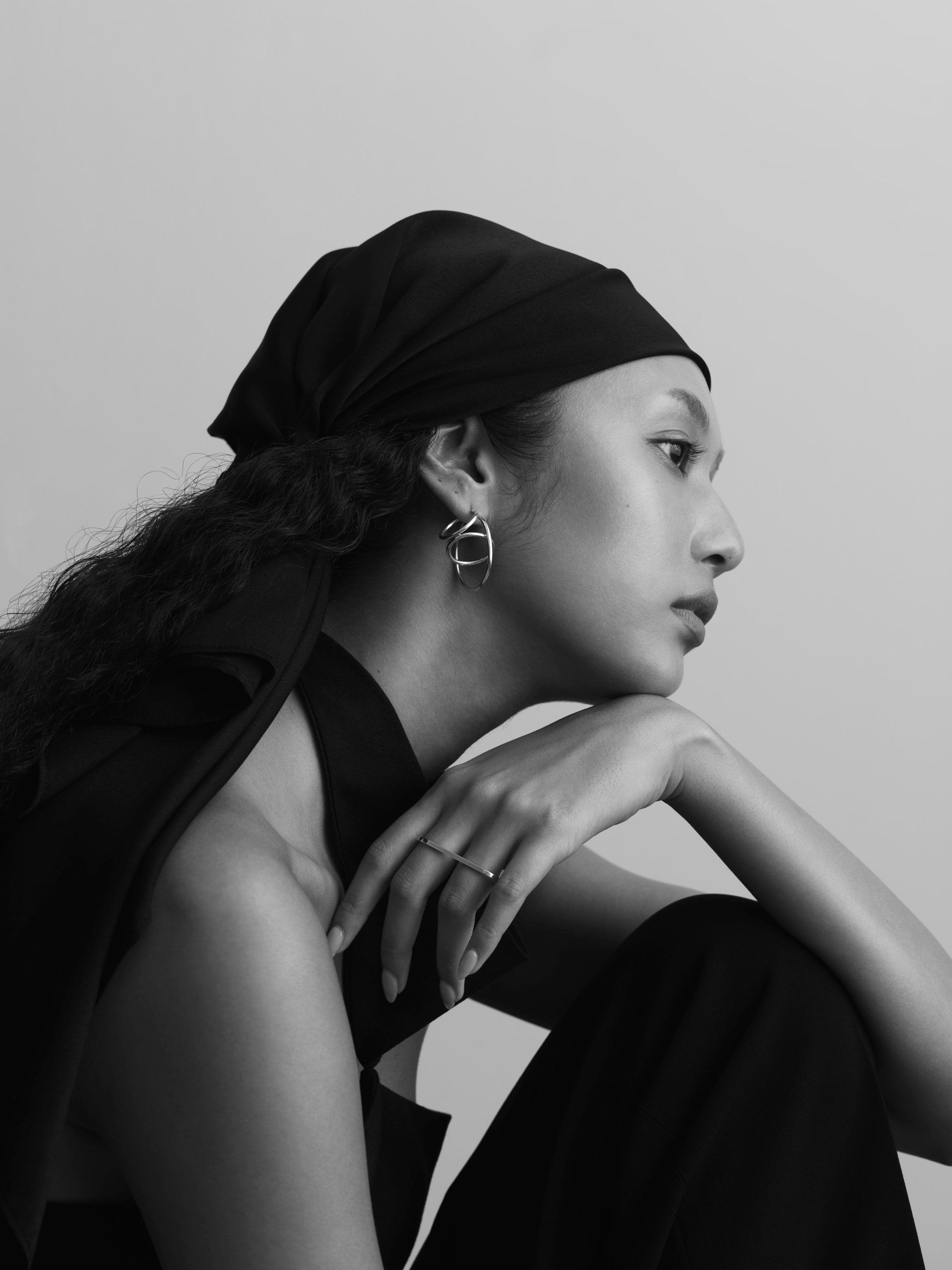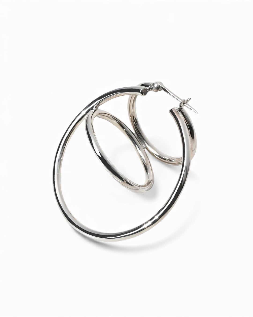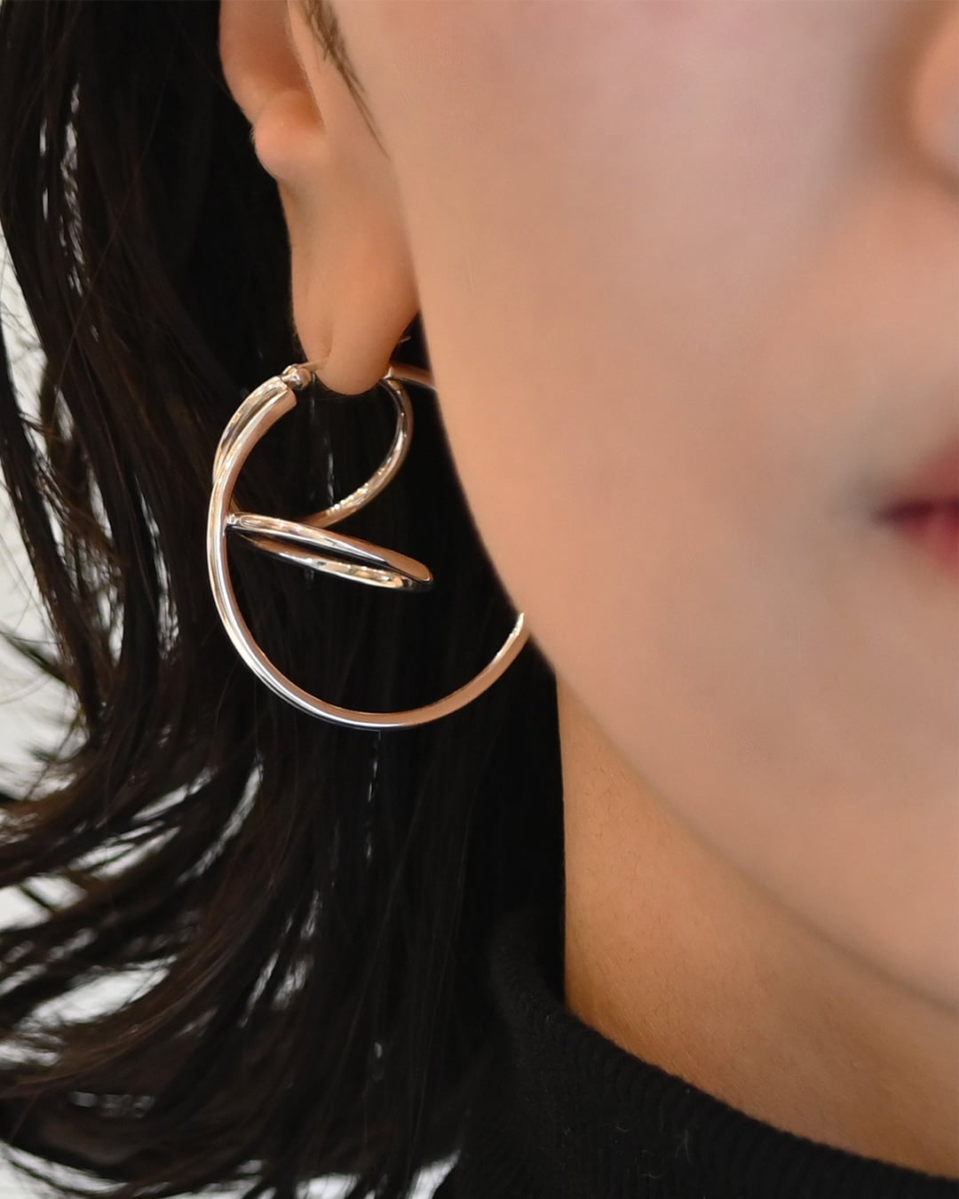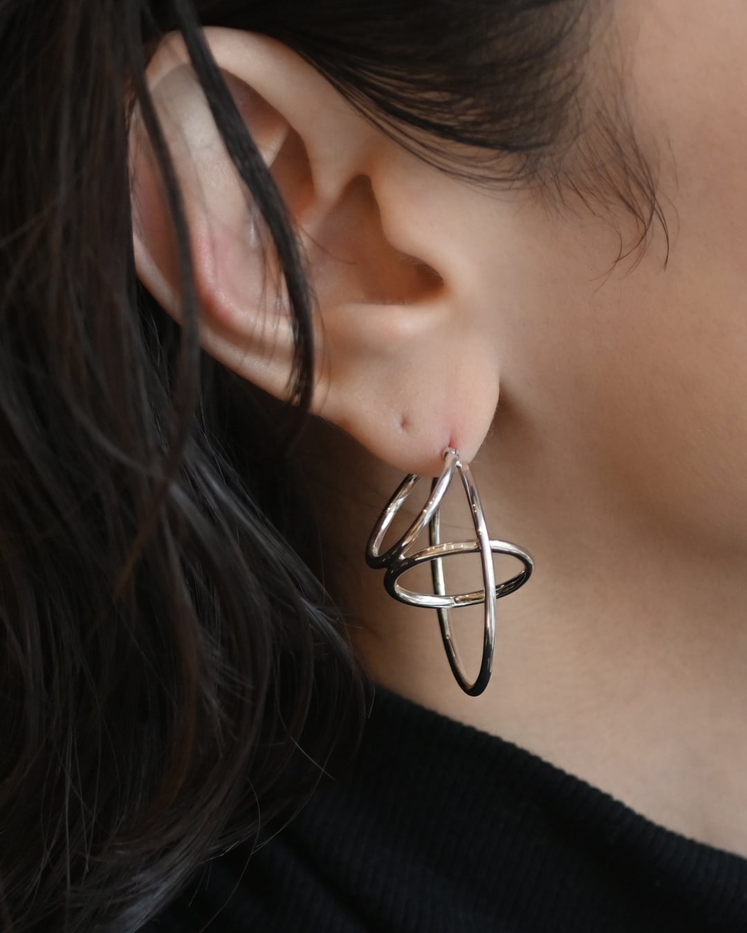 3つの円が重なり合った、立体感が特徴のピアス。通常のフープピアスと一線を画した、モダンで遊び心のあるデザインです。存在感がありながらも、軽い付け心地。キャッチレスなのも嬉しいポイントです。