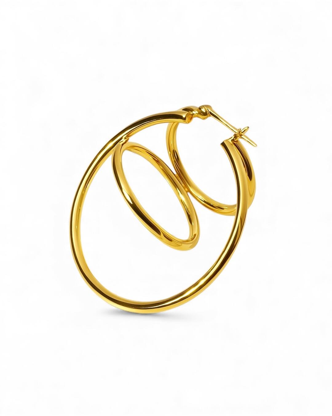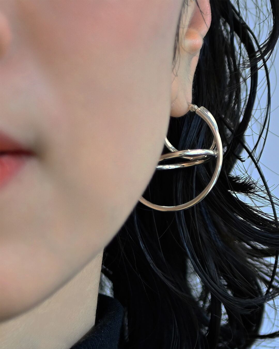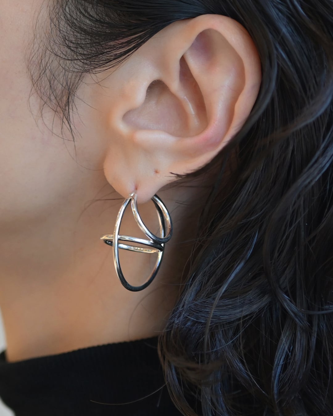 3つの円が重なり合った、立体感が特徴のピアス。通常のフープピアスと一線を画した、モダンで遊び心のあるデザインです。存在感がありながらも、軽い付け心地。キャッチレスなのも嬉しいポイントです。