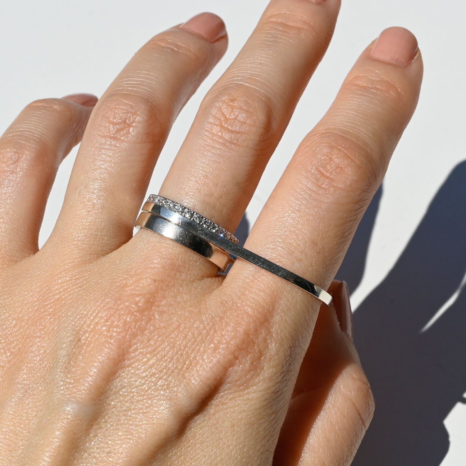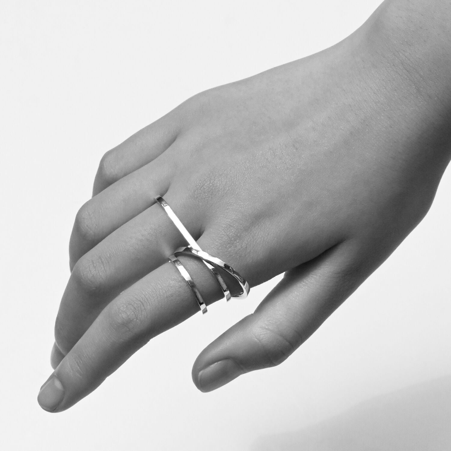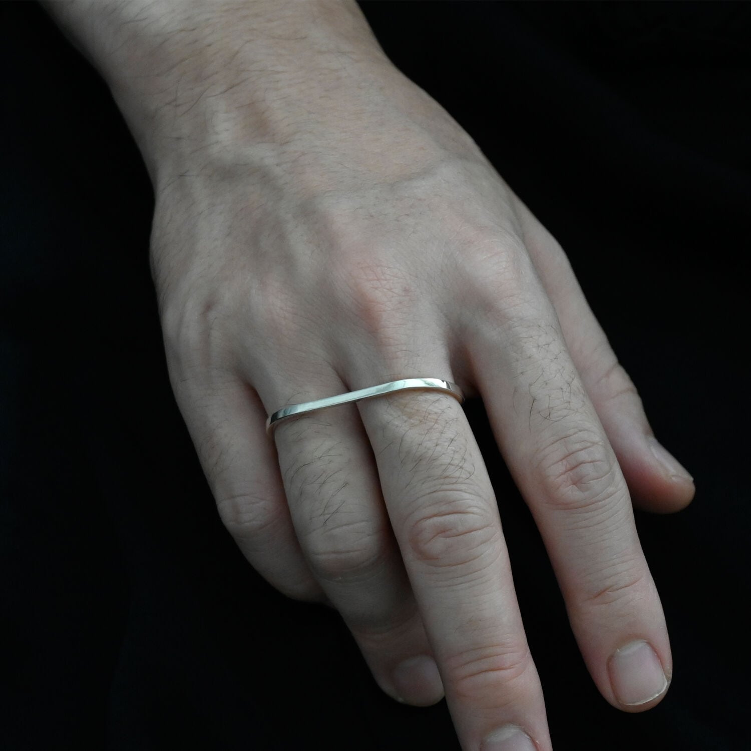2本指用のリング。エッジのあるリングですが、指に当たる内側は丸くなっているため滑らかな付け心地です。シンプルを極めたジェンダーレスなデザイン。一本で着用したり、普段つけているリングにプラスしたりと、スタイリングの幅が広がるリングです。