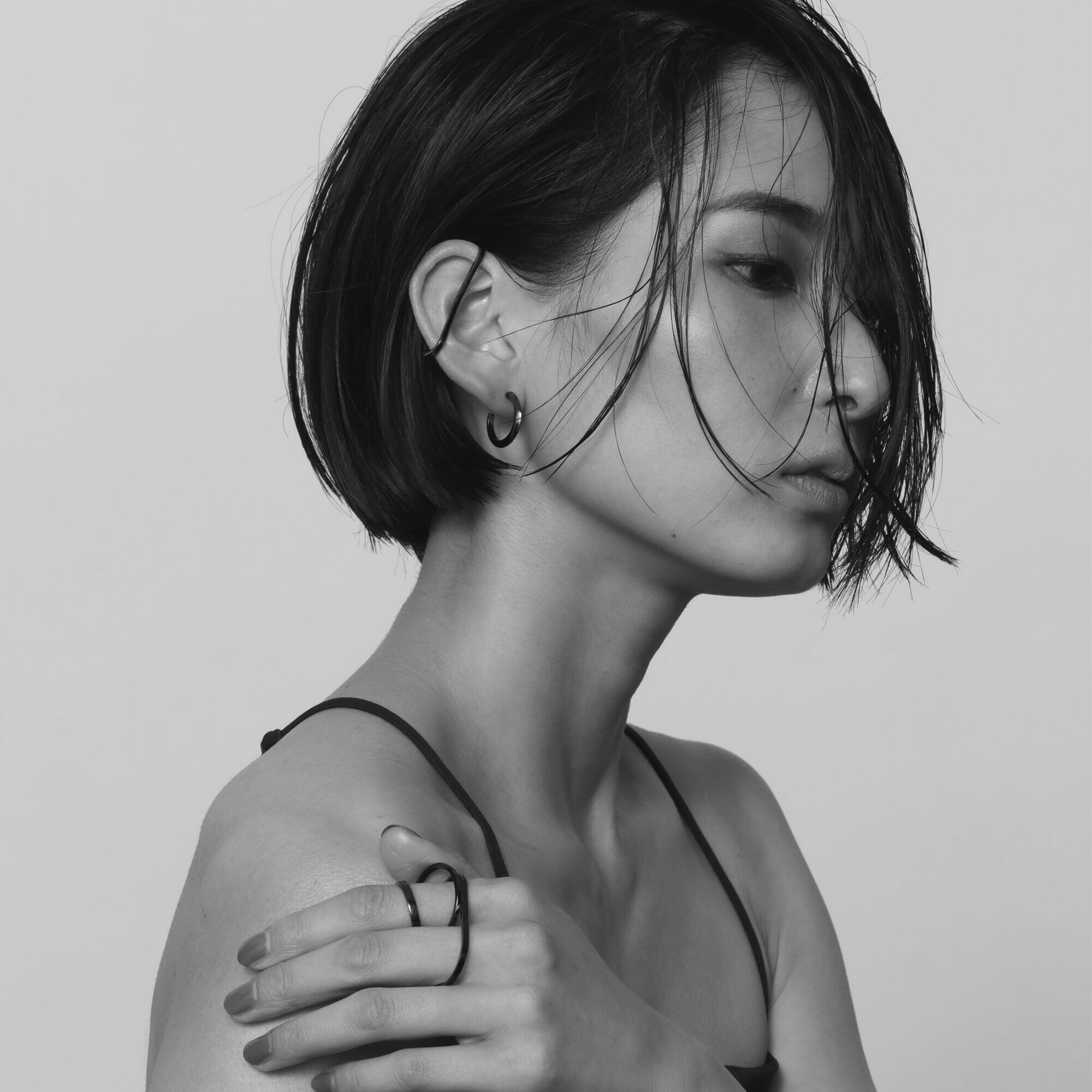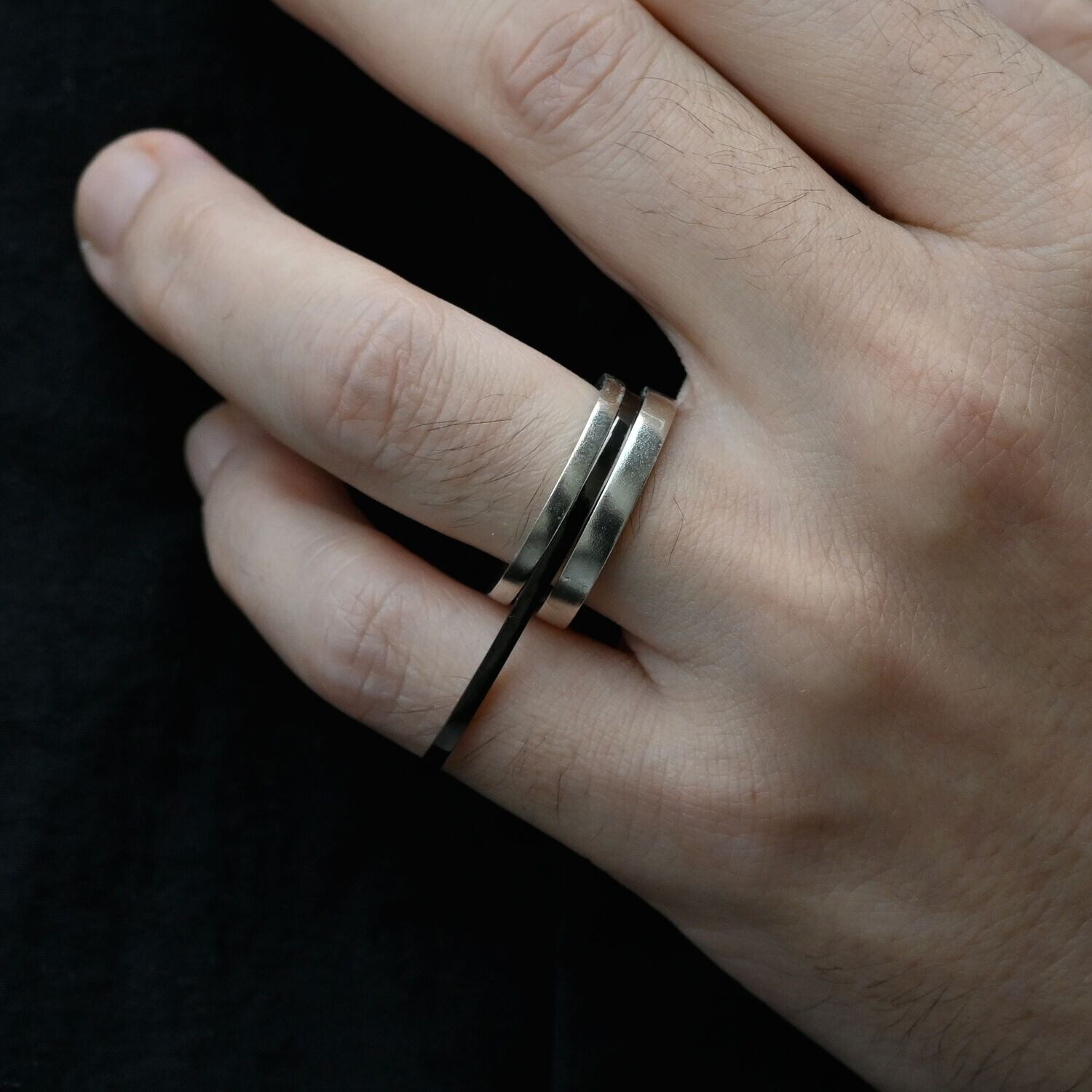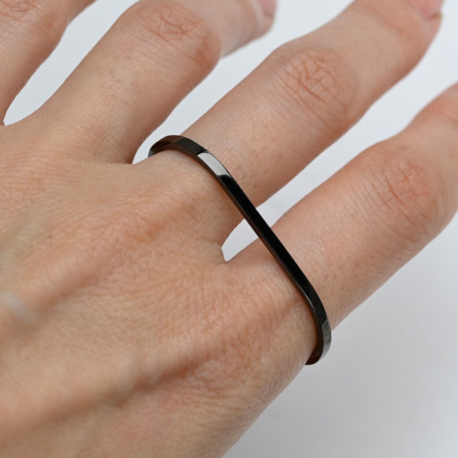 2本指用のリング。エッジのあるリングですが、指に当たる内側は丸くなっているため滑らかな付け心地です。シンプルを極めたジェンダーレスなデザイン。一本で着用したり、普段つけているリングにプラスしたりと、スタイリングの幅が広がるリングです。