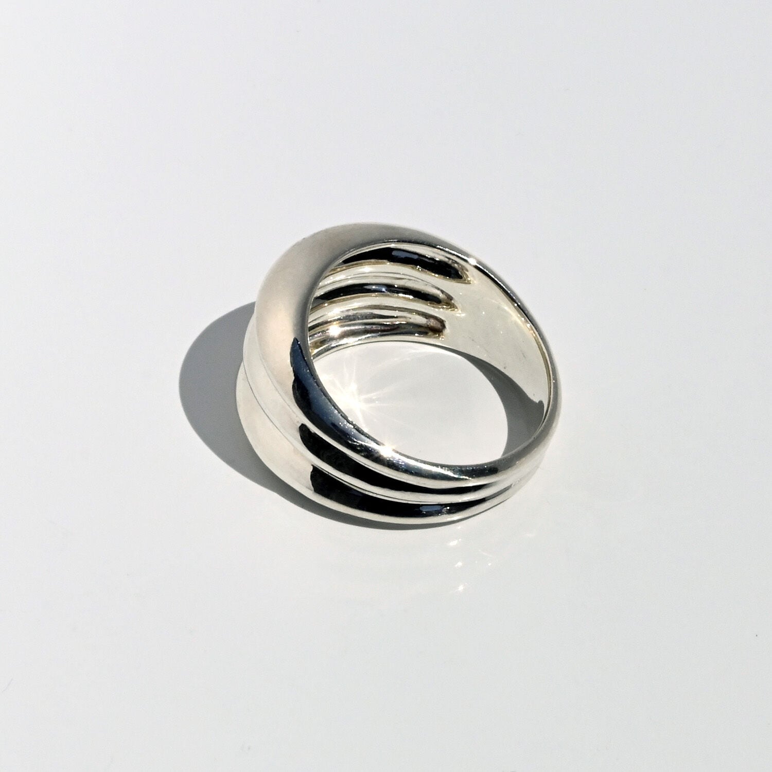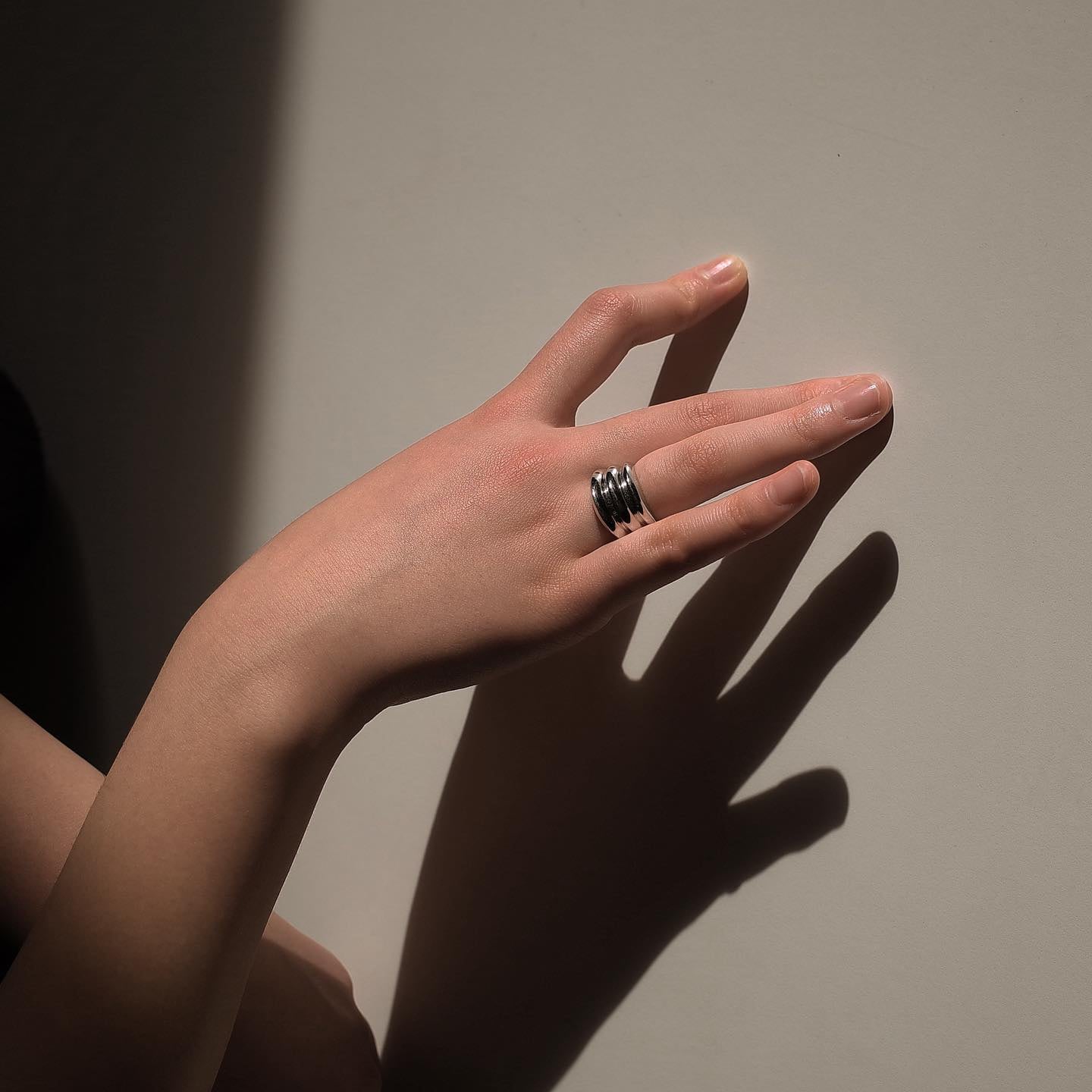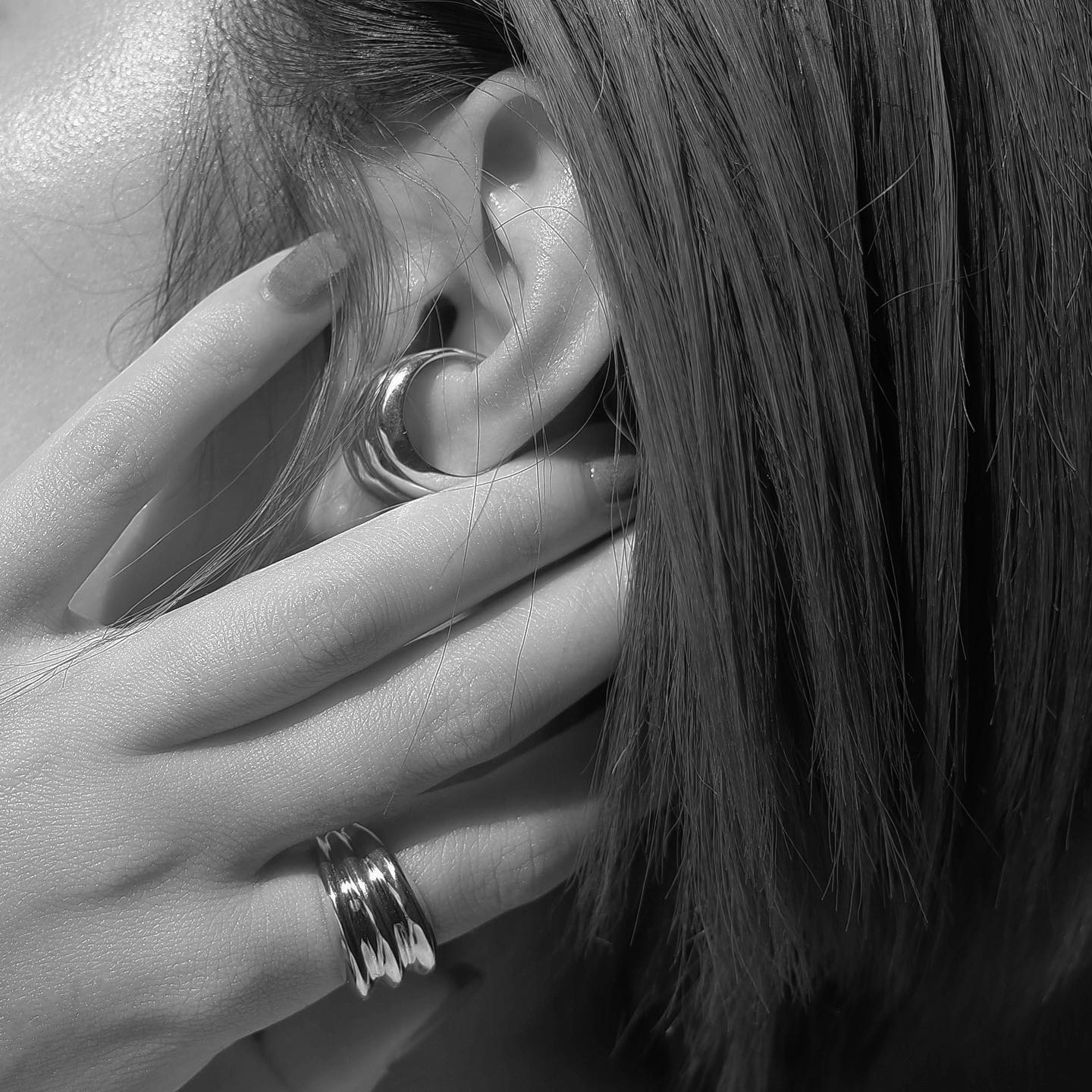 Theo collectionの中で最もボリュームのあるリング。内側を裏抜きしているので、見た目より軽やかなつけ心地です。モダンさとヴィンテージライクな重厚感を感じられるデザイン。幅広のリングは指をすっきり長く見せてくれるのが魅力です。 幅広なデザインのため、通常お選びいただくサイズより1〜2号のサイズアップがオススメです。