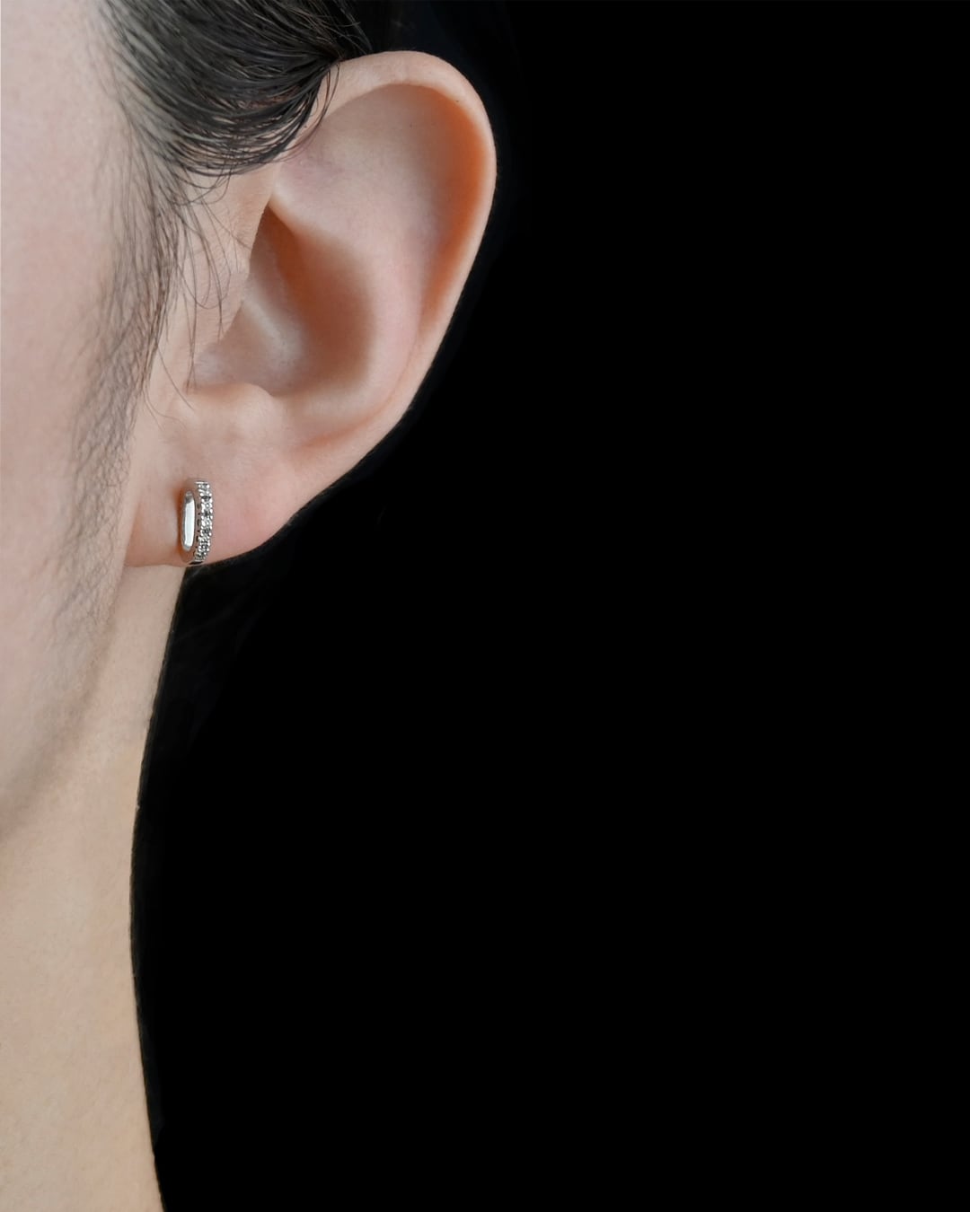 Oの形をしたモチーフが耳に対して垂直に着くデザインのピアス。正面に5石のメレダイヤをセットすることで、小さいサイズのピアスでありながらも、ダイヤモンドの煌めきがさりげない存在感を演出します。