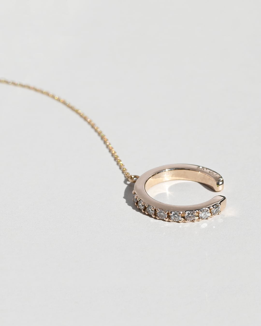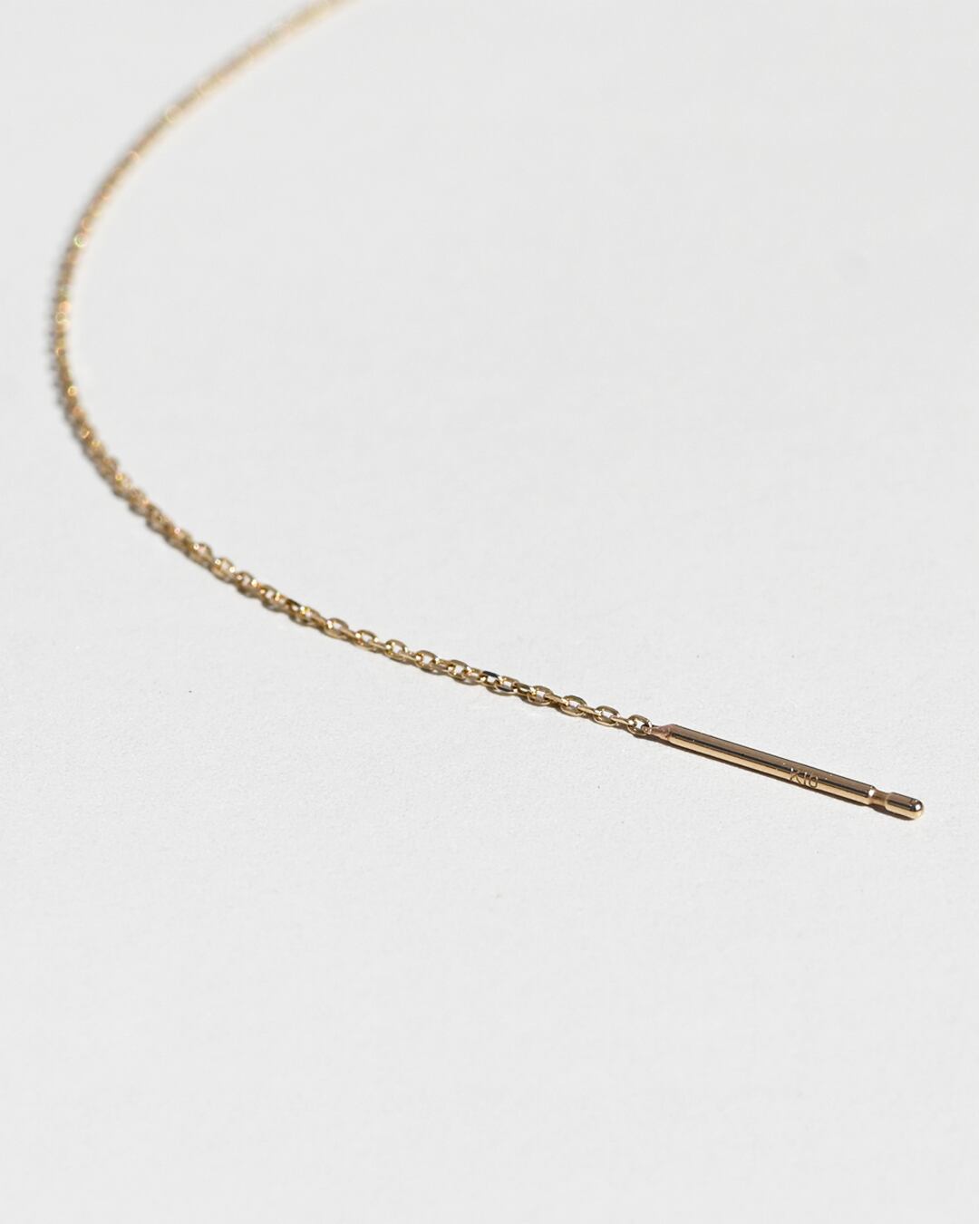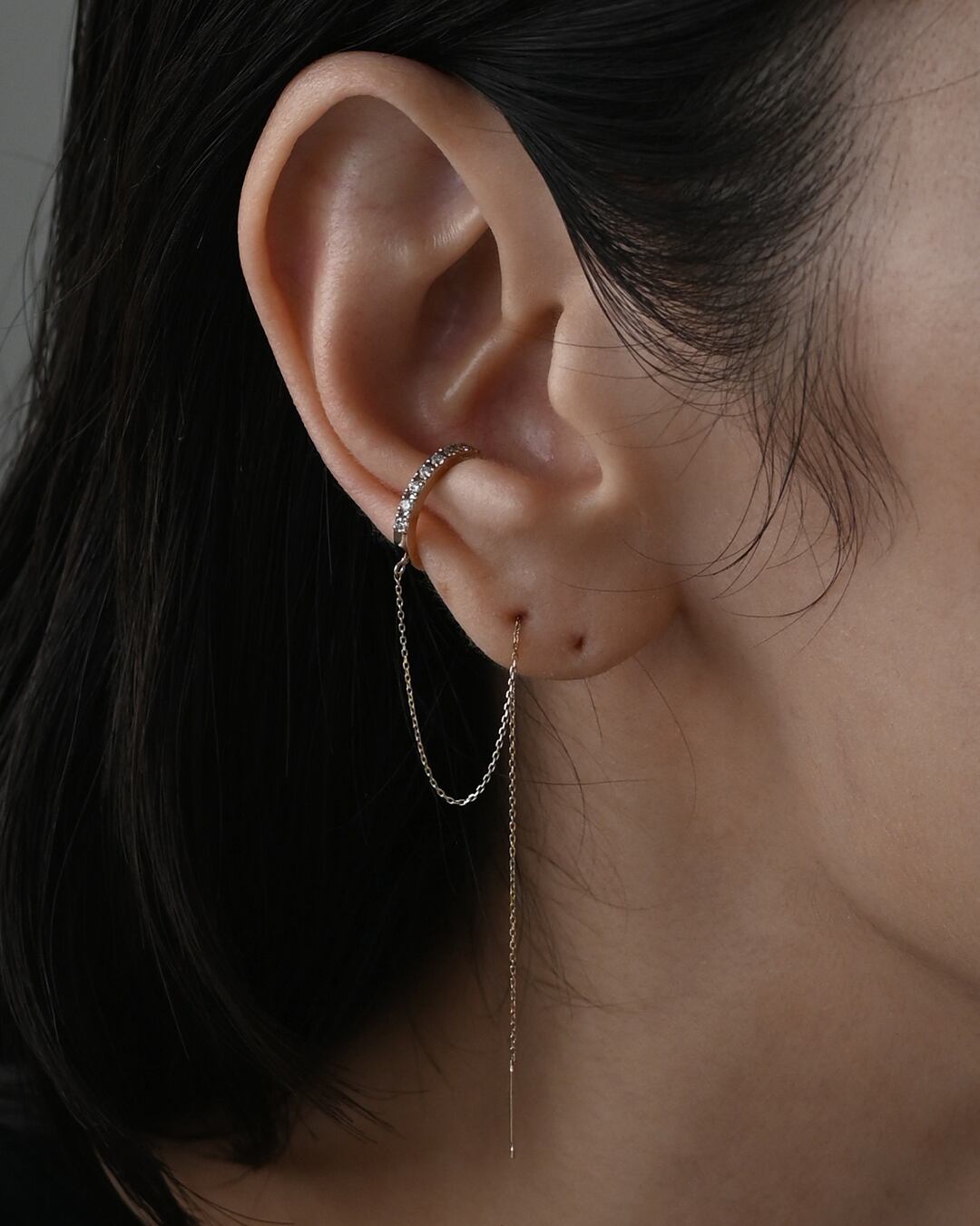 Isle diamond earcuffに華奢なチェーンをプラスすることで華やかさが増したイヤカフ。チェーンは極細のあずきチェーンを採用。繊細な光を放ち、高級感があります。ピアスホールの空いている方は、チェーンやポスト部分をピアスホールに通すことでイヤカフを落としてしまう心配もぐっと軽減。シンプルなデザインなので、お手持ちのイヤカフとの重ね付けもオススメです。