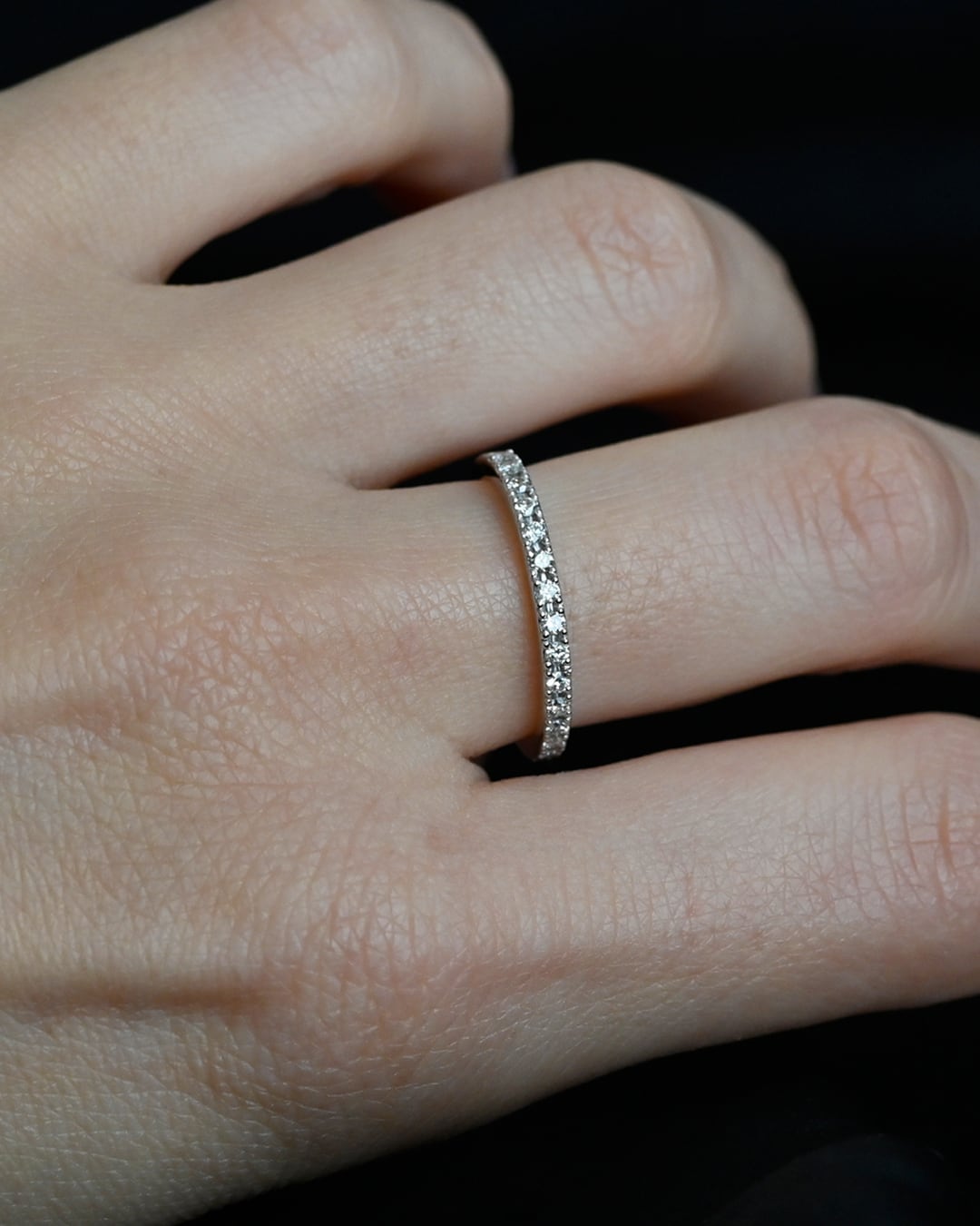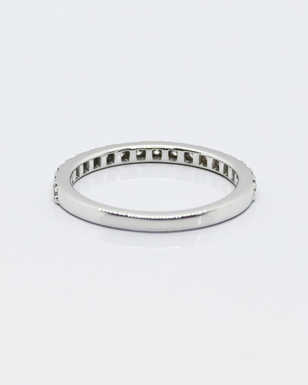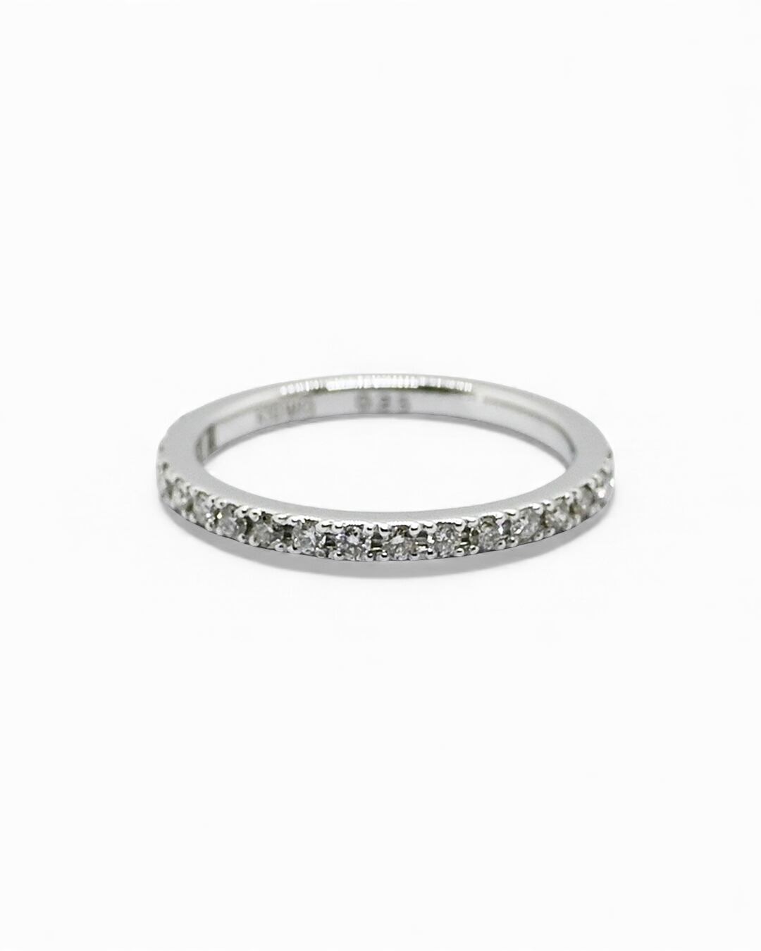 ベーシックなハーフエタニティーリング。指に当たる内側は丸くなっているため滑らかな付け心地です。さらりと一本で着用したり、普段つけているリングにプラスしたりと、スタイリングの幅が広がるリングです。