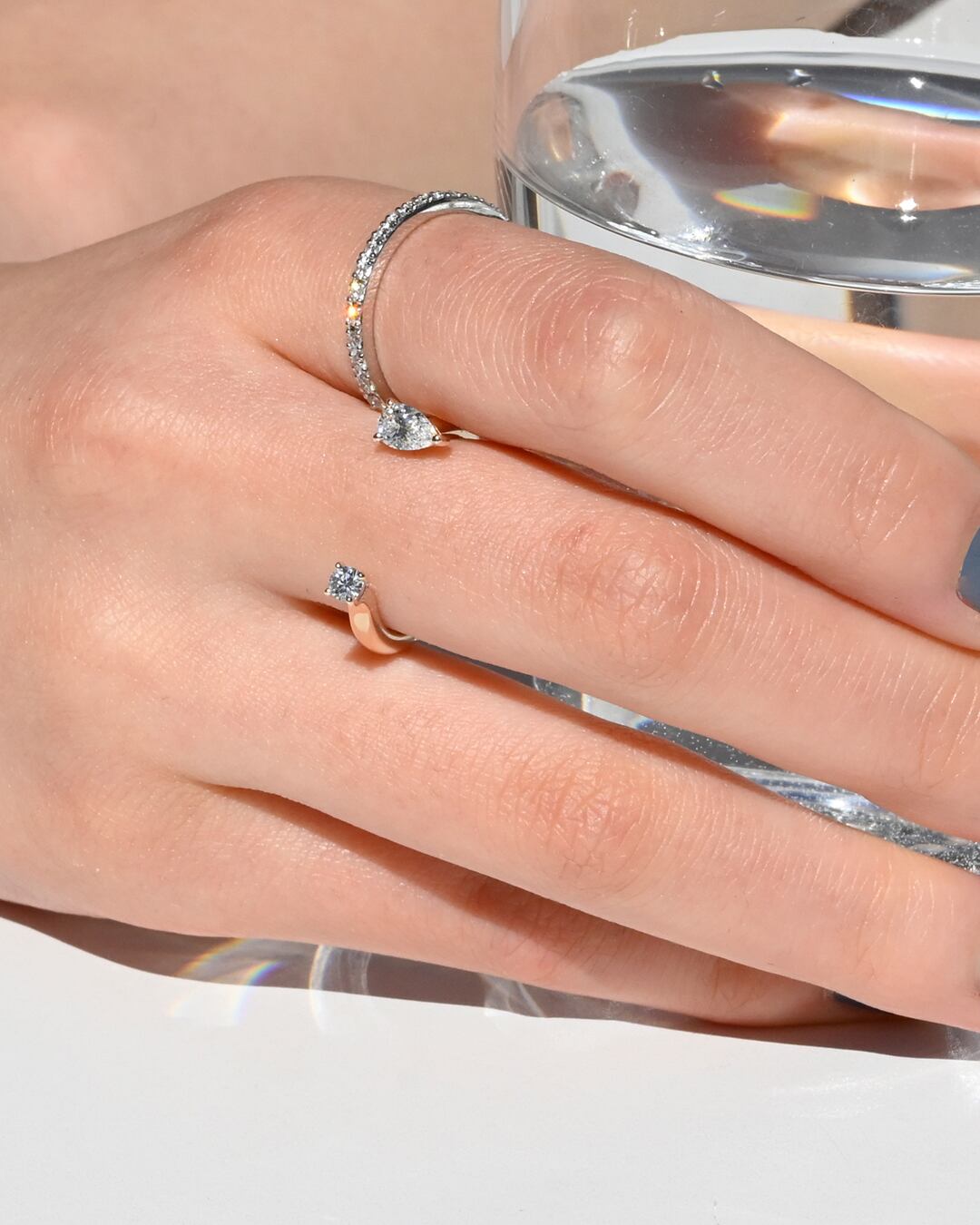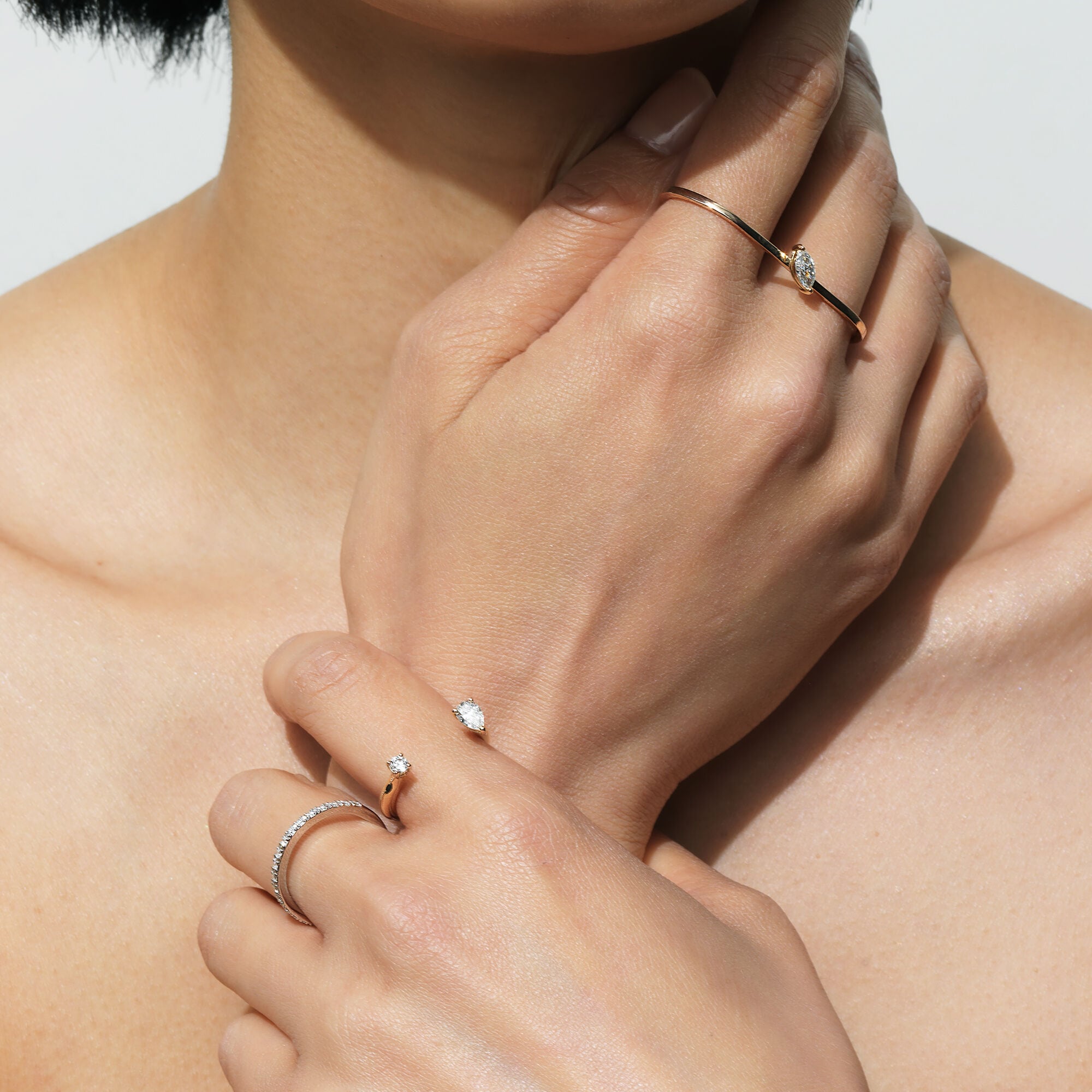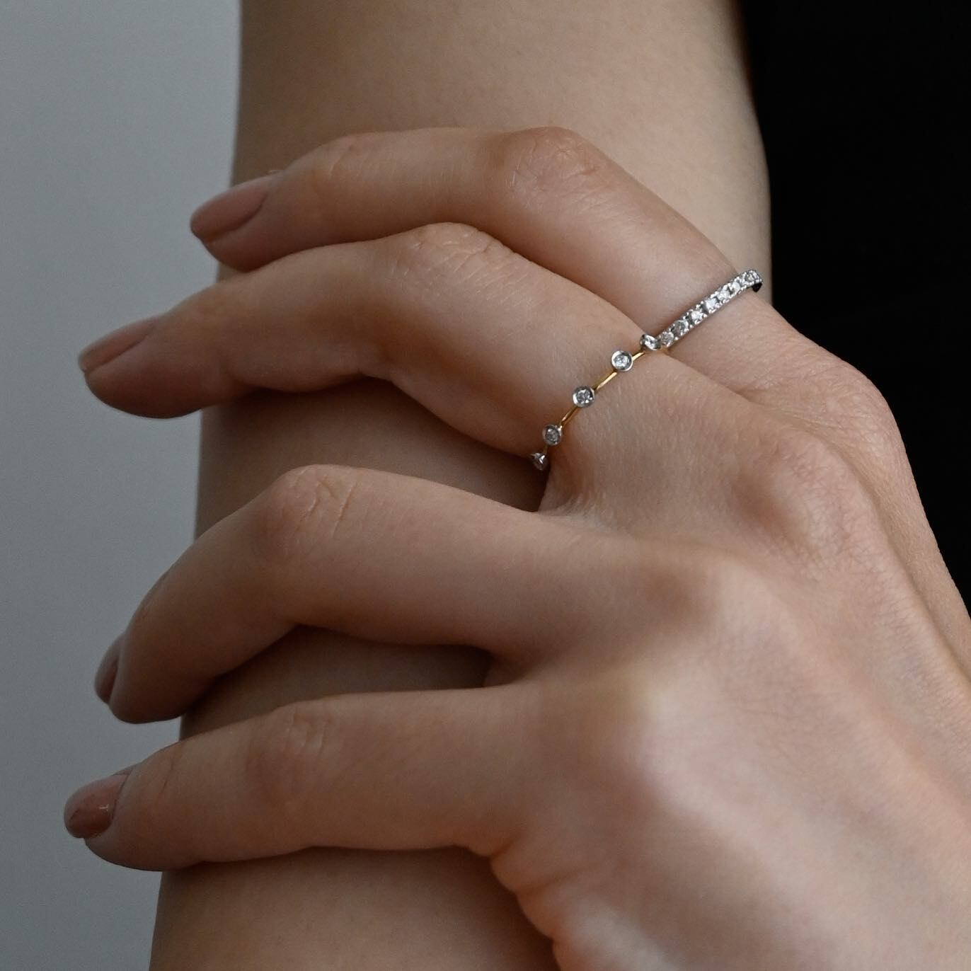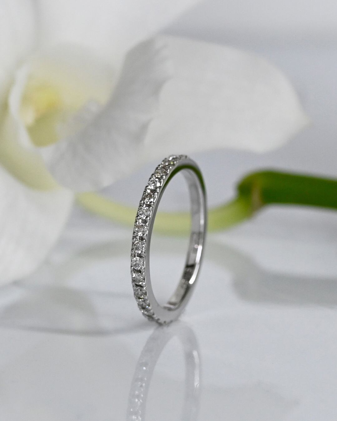 ベーシックなハーフエタニティーリング。指に当たる内側は丸くなっているため滑らかな付け心地です。さらりと一本で着用したり、普段つけているリングにプラスしたりと、スタイリングの幅が広がるリングです。