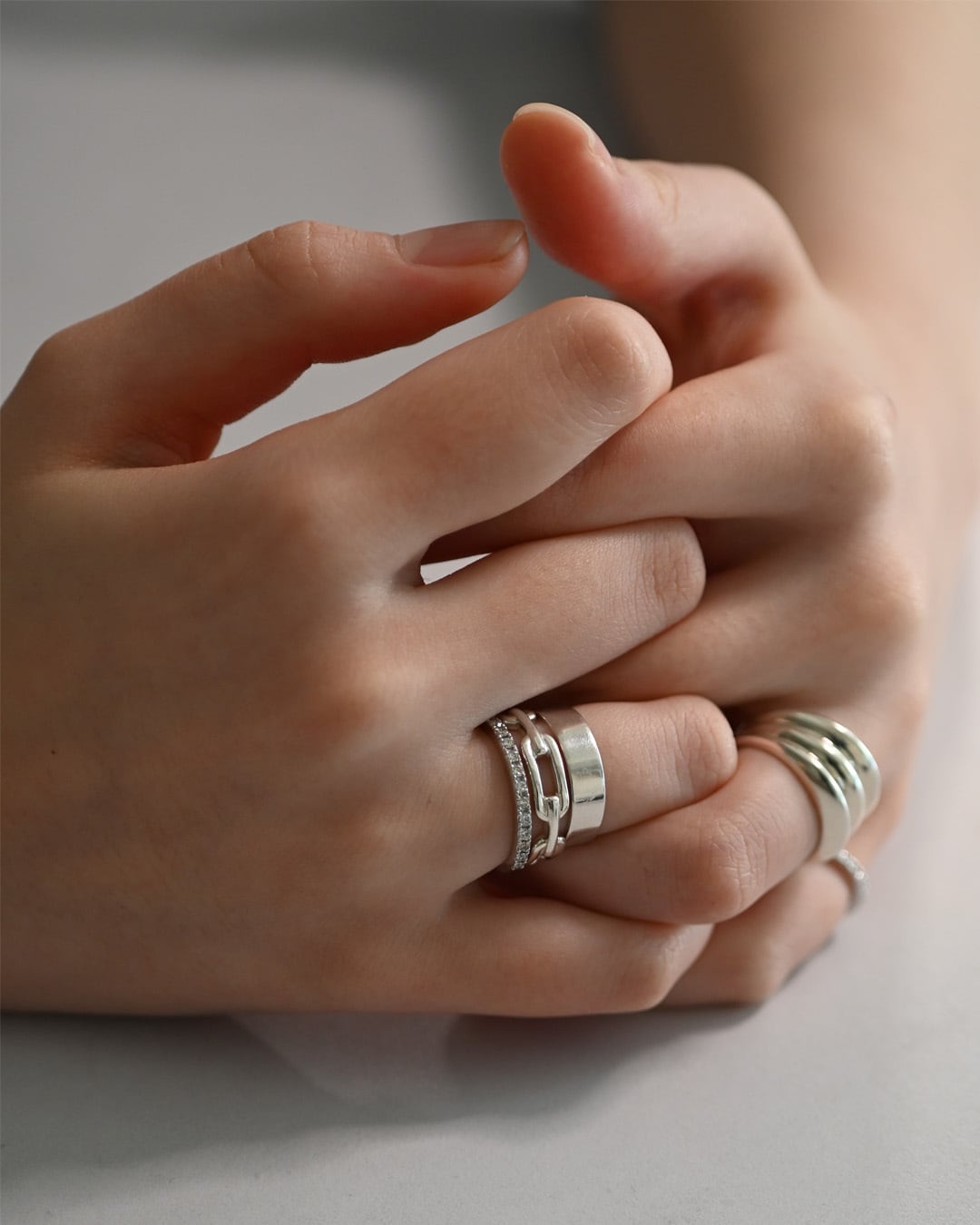 連なりは、強さの象徴。 ミニマルなフォルムの連続が、 手元に自然な存在感と余白を生む。 ひとつでも潔く、 重ねてもしっくりくるデザインです。 【素材】 シルバー(K18コーティング) 【サイズ】 幅 約5mm 【原産国】 日本 ◆国内送料無料 ◆オリジナルポーチ付き